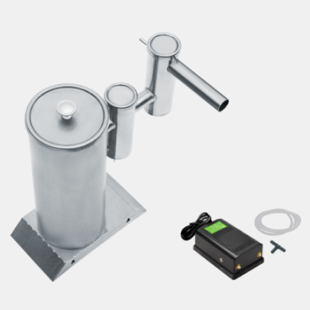 Заключительная ступень очистки - классический сухопарник. Сажа и остаточный конденсат оседают на стенках и дне, а дым проходит финальную стадию охлаждения. Мощный компрессор, оснащённый двумя ступенями регулировки, обеспечивает бесперебойную подачу дыма в коптильную камеру.