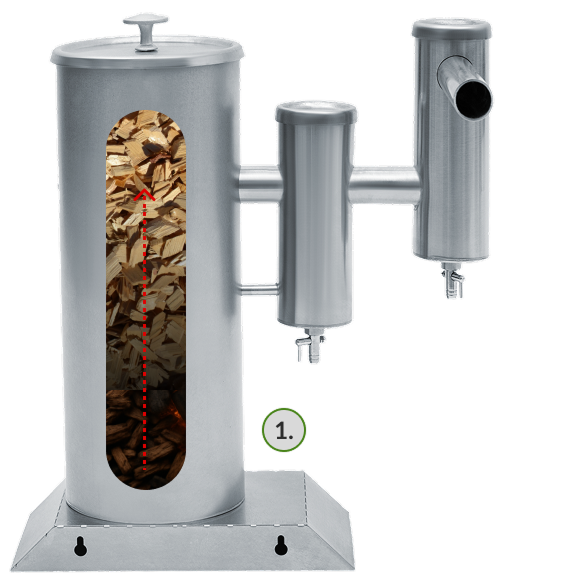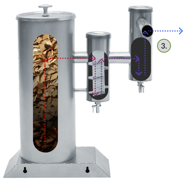 За счёт вертикальной перегородки с горизонтальными отсекателями у примесей не остаётся шансов. Очищаясь, дым спускается вниз и огибает сухопарник. Тяжёлые фракции отделяются в специальные ёмкости, которые рекомендуется чистить после каждого копчения.